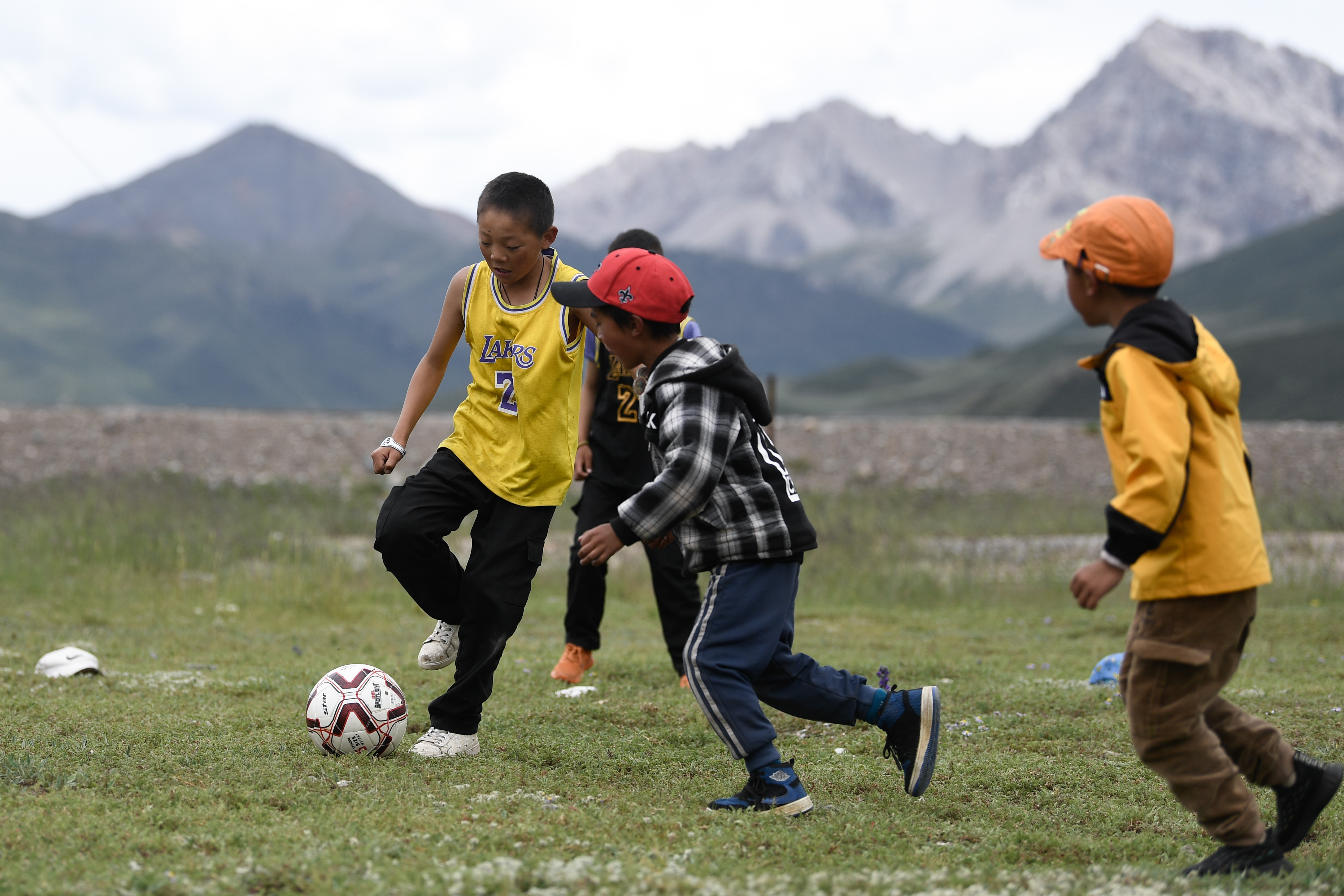 果洛州藏族儿童在草地上踢球。新华社记者张龙摄