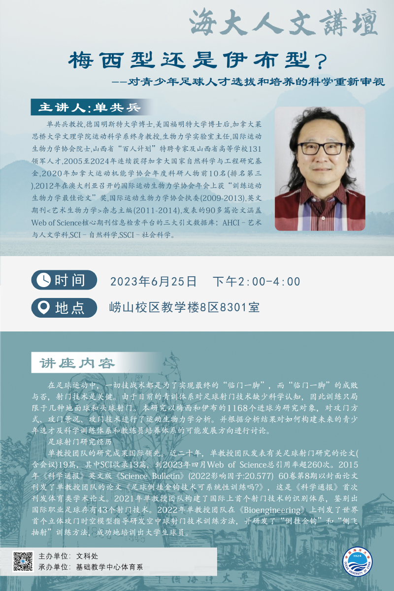 澎湃新闻(www.thepaper.cn)注意到,该讲座报告题为《梅西型还是伊布型——对青少年足球人才选拔和培养的科学重新审视》,主讲人系加拿大莱思桥大学(UniversityofLethbridge)运动科学系终身教授、生物力学实验室主任单共兵。