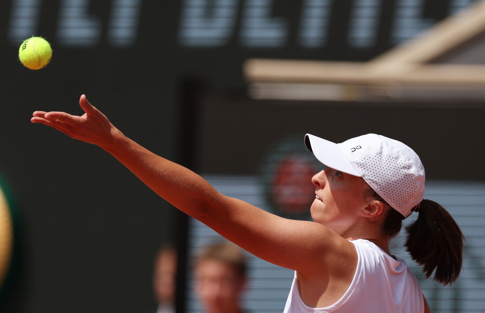 6月10日,斯维亚特克在比赛中发球。新华社记者高静摄