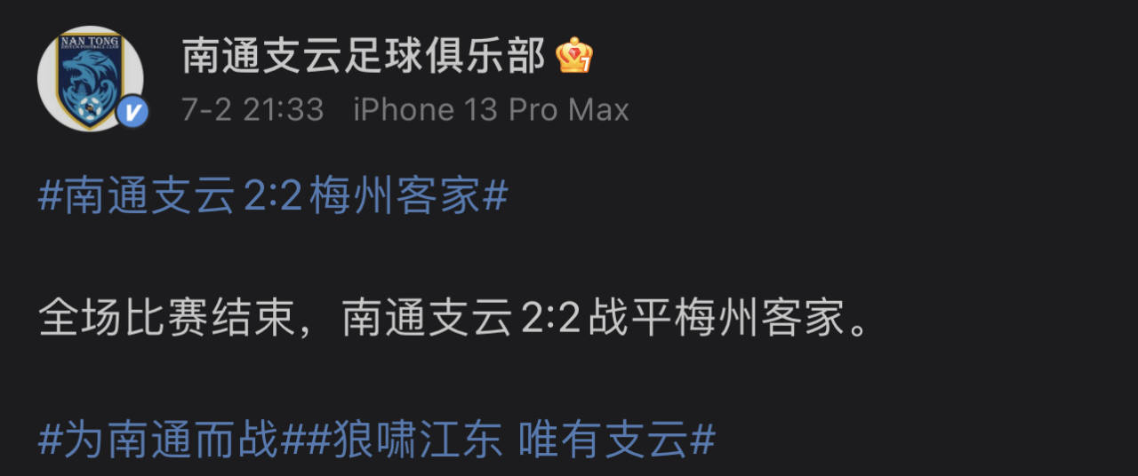 现代快报讯(记者 花宇)7月2日晚,2023赛季中超联赛第14轮,南通支云主场迎战梅州客家。双方在大雨中上演“进球大战”,第22分钟,梅州客家先进一球后,第49分钟,南通支云扳平比分。第90分钟,南通支云再次破门得分领先。在比赛进入最后读秒阶段时,梅州客家依靠一次角球进攻再次扳平。最终,南通支云2:2战平梅州客家。