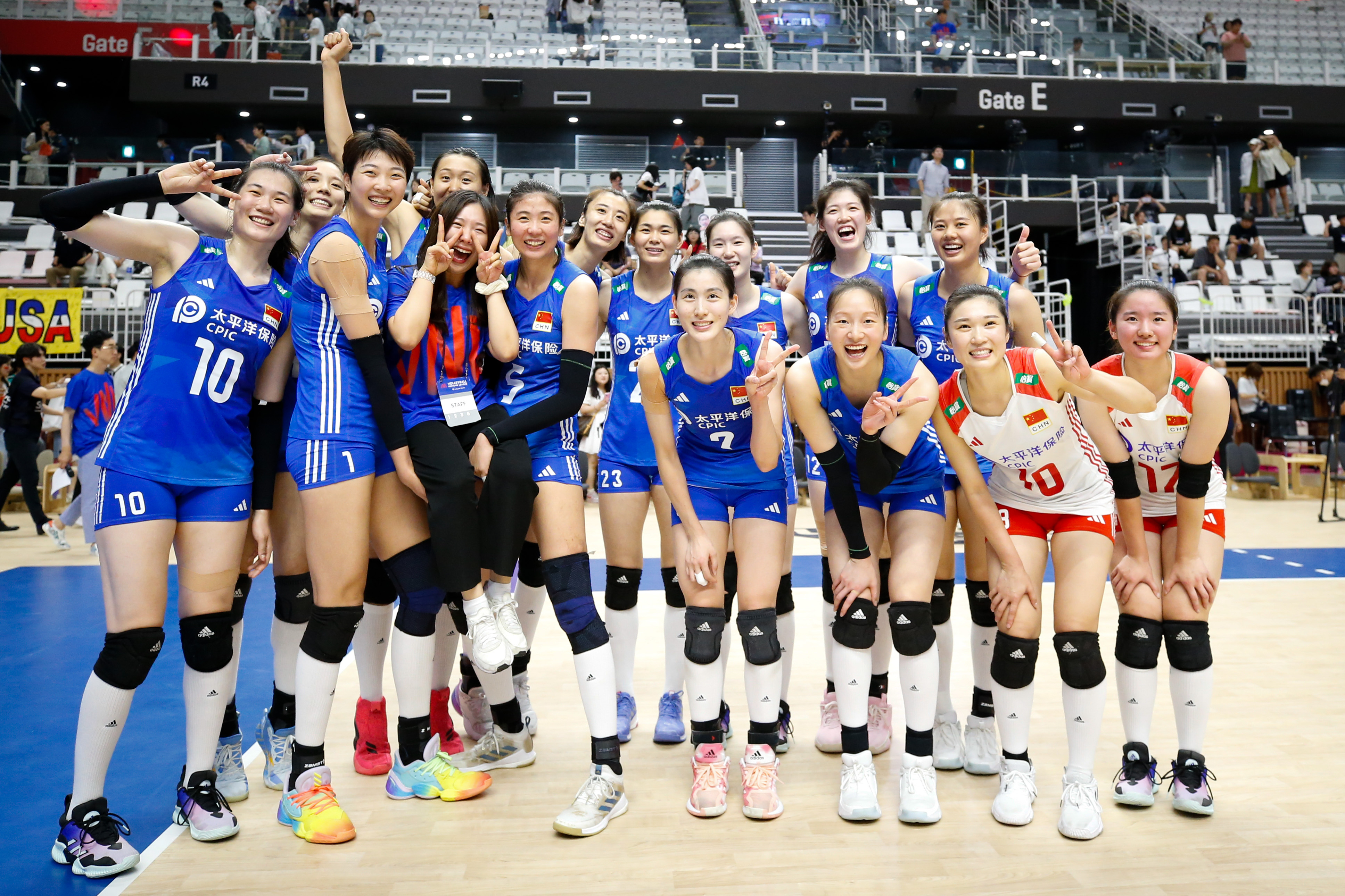 7月2日,中国队球员及工作人员在世界女排联赛韩国水原站赛后合影。新华社记者王益亮摄