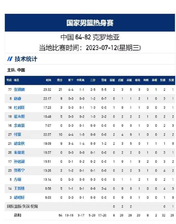 7月13日,根据中国篮球之队官方公布的赛况,中国男篮与克罗地亚男篮进行一场热身赛——最终中国男篮以64-82不敌对手,遭遇热身赛开门黑。