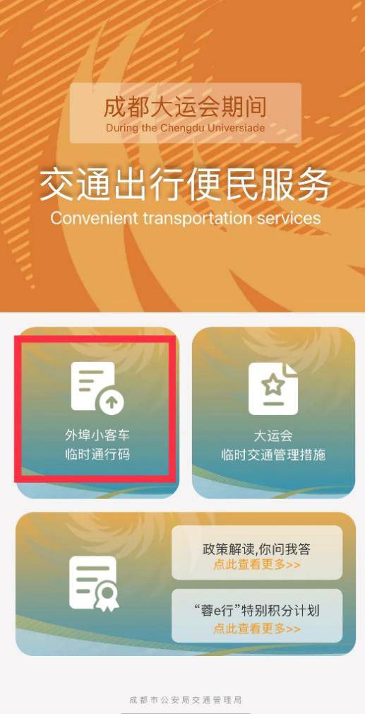 “蓉e行”平台将于7月19日正式上线“外埠小客车临时通行码”申领功能。外埠小客车驾驶员可通过搜索“蓉e行”微信公众号,注册后在平台申领“外埠小客车临时通行码”。
