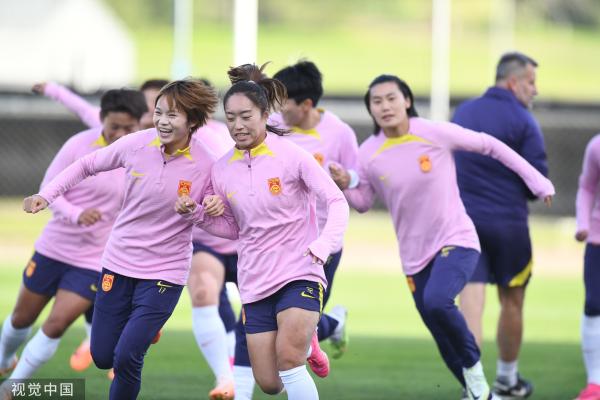 正式训练前,所有队员径直来到看台下方,姑娘们挥着手向球迷们问好,看台上响起热烈掌声:“中国女足加油!”“中国女足最棒!”