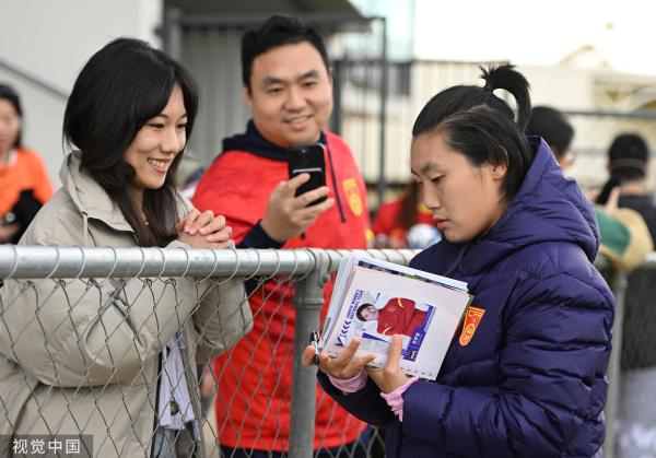 离开前,她们依次来到看台下给球迷签名。“王霜,要连过10人啊!”“张琳艳,要多进球啊!”……温暖的祝福让姑娘们连声道谢。