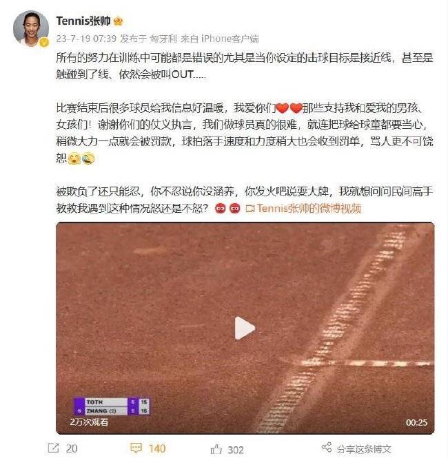 在WTA250布达佩斯站女单首轮中,2号种子张帅迎战持外卡参赛的匈牙利本土选手托特。比赛首盘第11局,张帅发球。15-15时,张帅一记回球明显是压线的界内球,却被主裁判为出界。