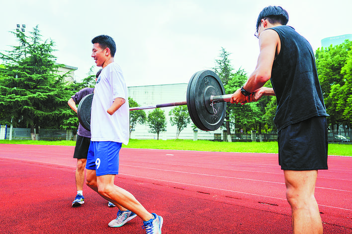 在队友的帮助下,陈翔宇正在做力量训练