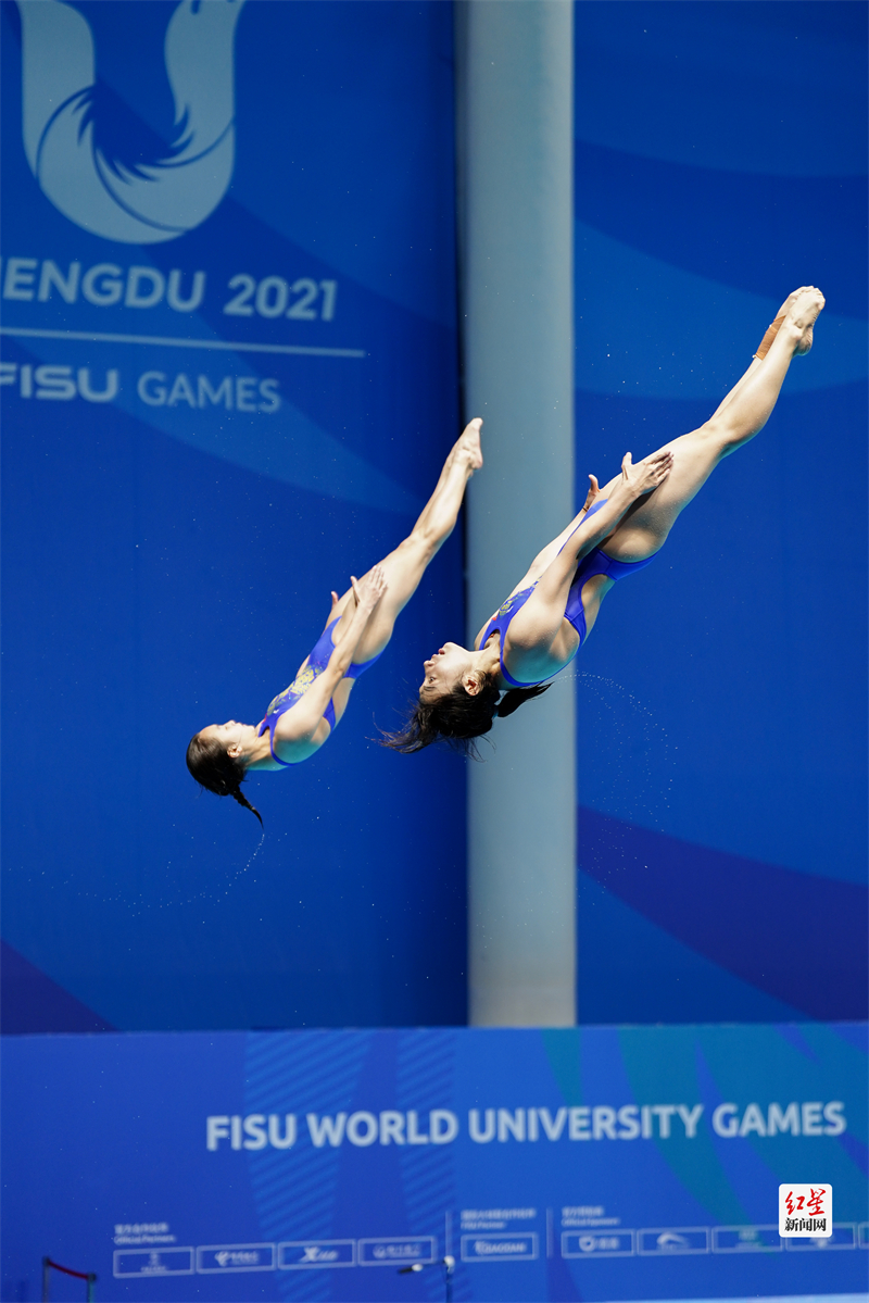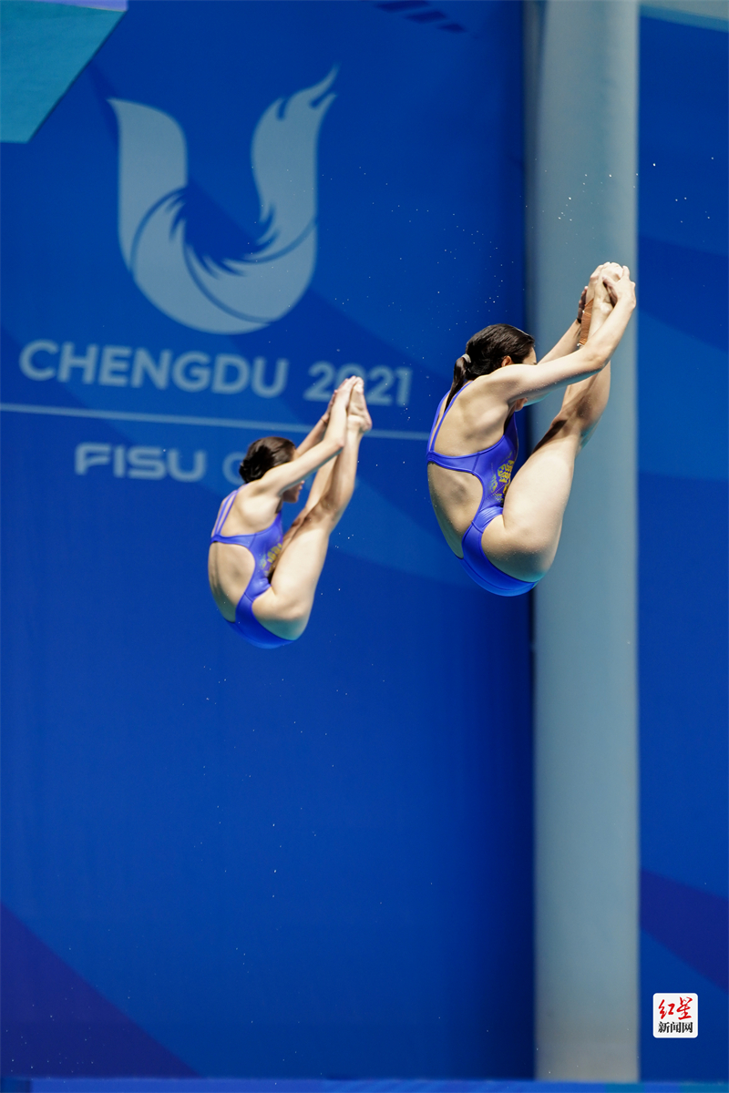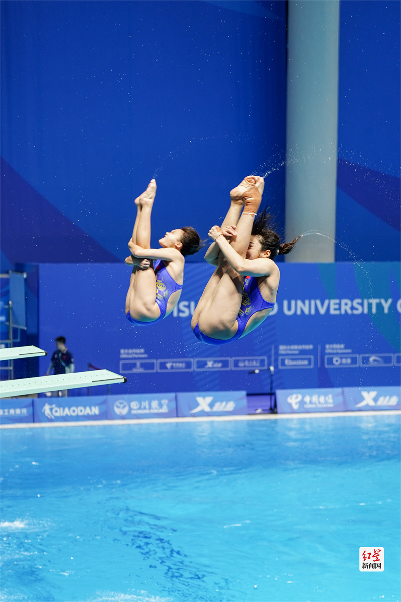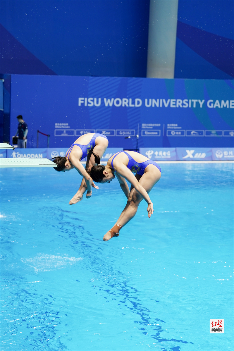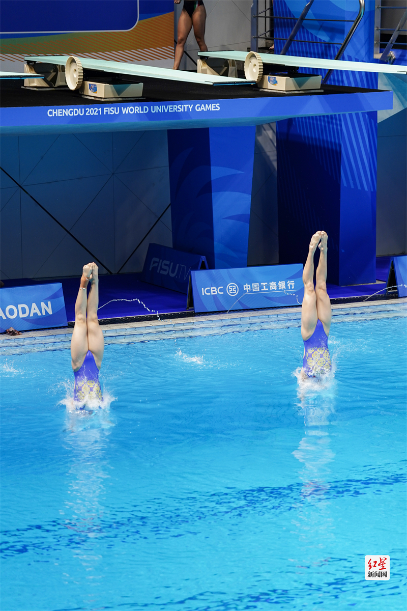 红星新闻网8月4日讯8月4日下午,在简阳文体中心游泳池馆举行的女子双人3米跳板决赛上,陈佳、杨睿琳以明显优势夺冠,为中国队在本届大运会跳水项目上拿下第八块金牌。在8月1日的女子1米跳板决赛中,陈佳也获得了金牌。(摄影:张翔升)