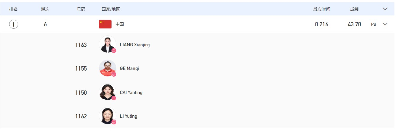 跟以往多次比赛一样,后程能力突出的李玉婷依然出战最后一棒。比赛时场地有些湿,虽然与第三棒蔡燕婷交接棒时有点不顺畅,不过幸好没出接力区。凭借强大的后程能力,李玉婷越跑越快,拉大与对手的差距,甚至转播镜头中只剩下她一人。最终,中国队以43秒70夺得冠军,波兰和南非分列二三名。