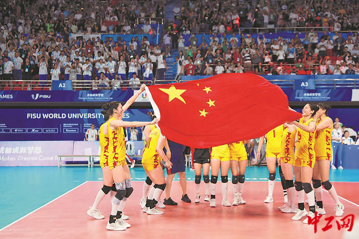 8月6日晚,在成都大运会女排决赛中,中国队以3比0战胜日本队,夺得冠军。工人日报—中工网记者蔚可任摄