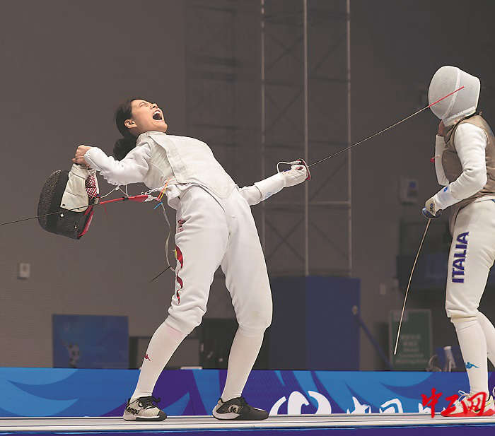 8月6日下午,在成都大运会女子花剑团体决赛中,中国队以45比22战胜意大利队获得冠军。图为中国选手黄芊芊在庆祝胜利。工人日报—中工网记者蔚可任摄