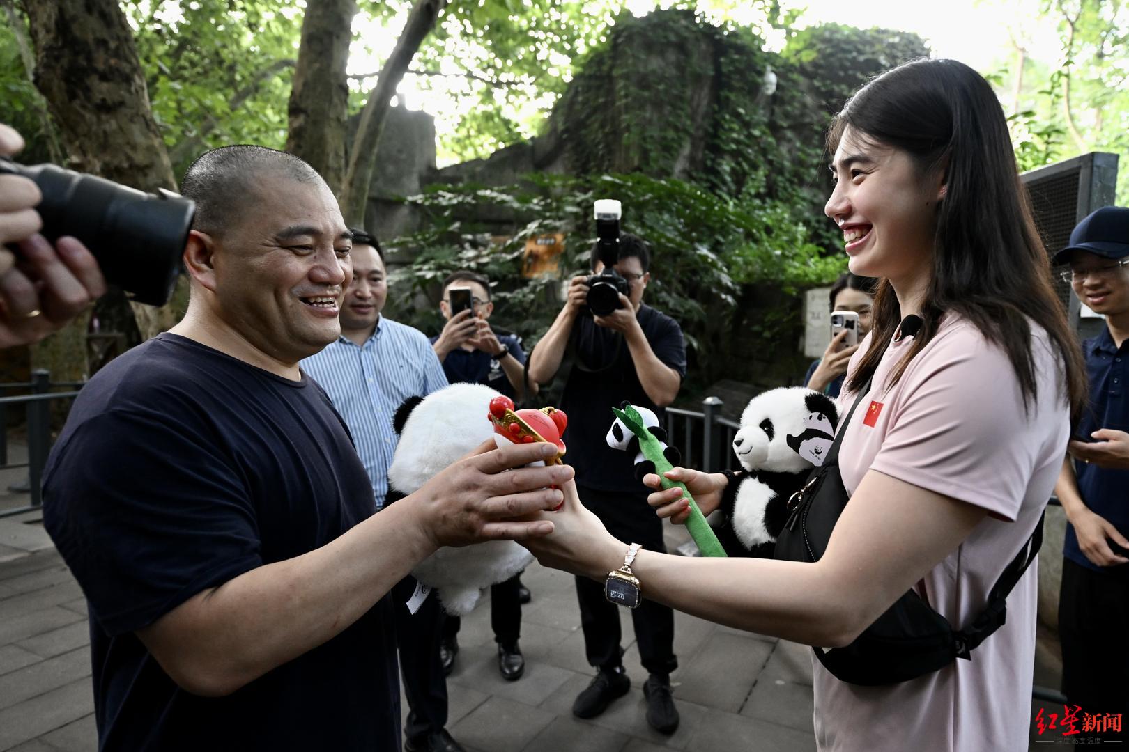 张雨霏说自己很喜欢看熊猫吃播,“每次看它们吃竹子发出咔咔的声音,特别脆,特别空,就觉得真的有那么好吃吗。今天在现场看见花花吃竹子,我自己都很想啃两口试试了。”