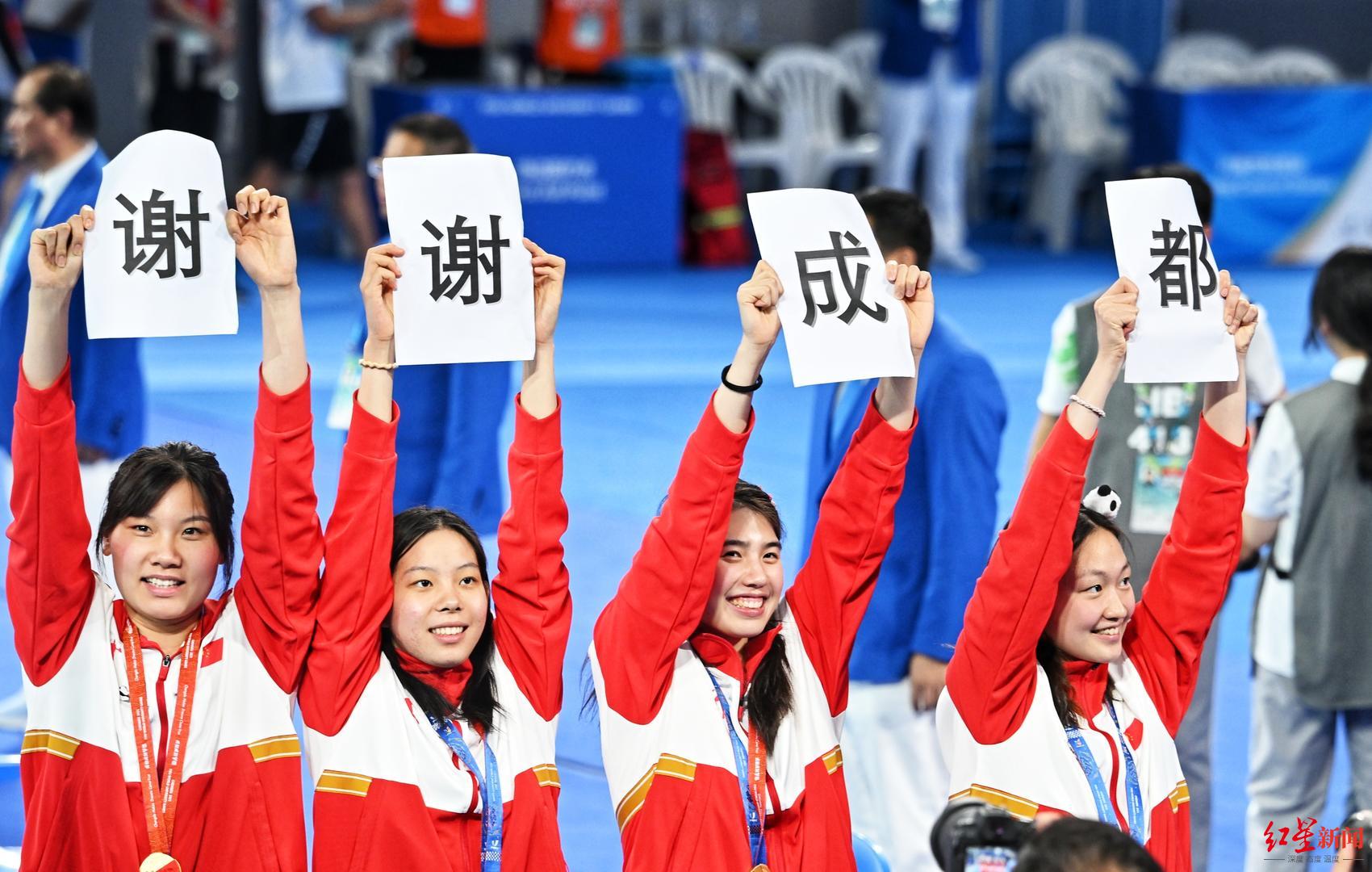 中国队获得女子4×100米混合泳冠军,拿出“谢谢成都”的标语