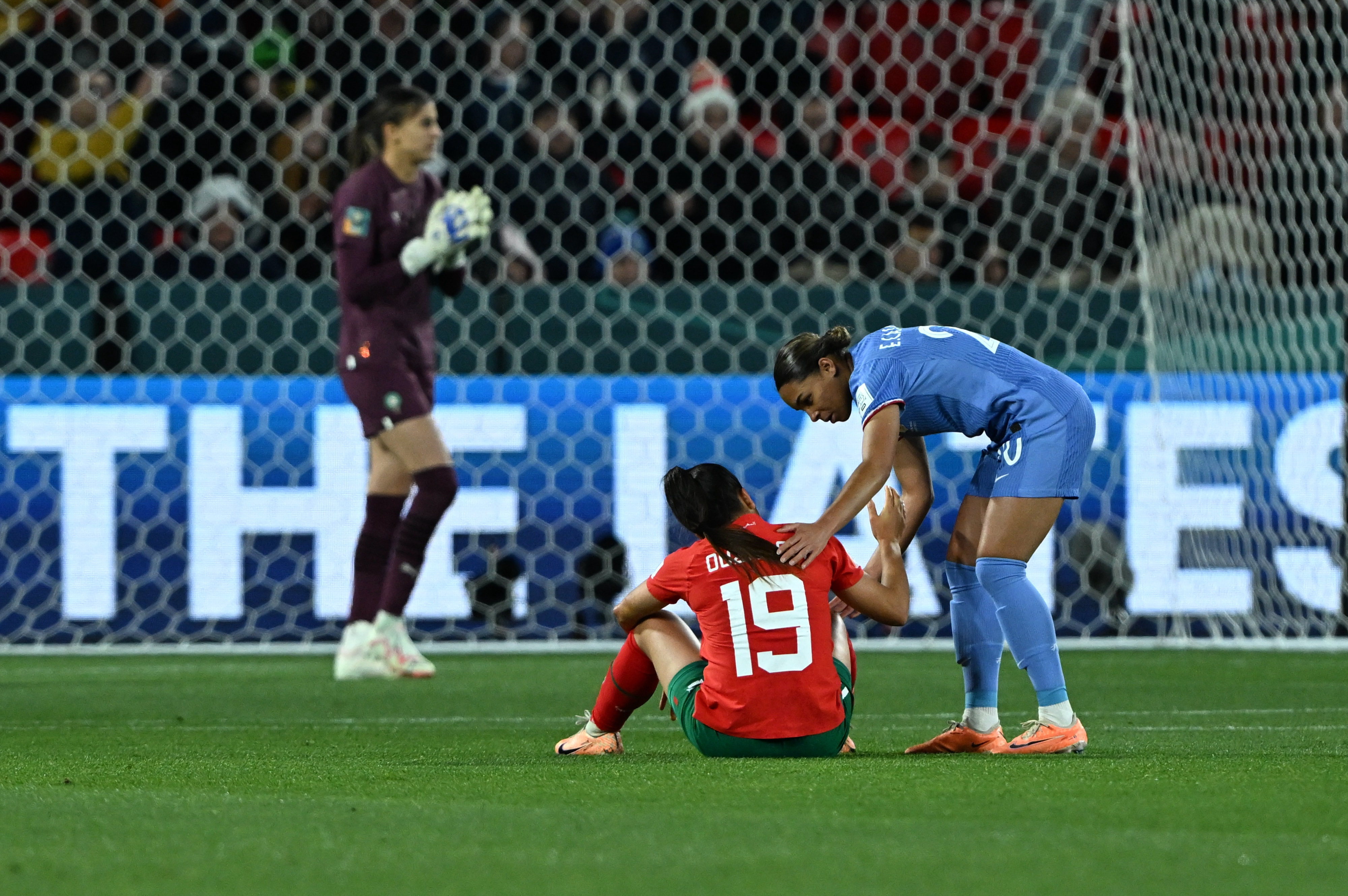 8月8日,法国队球员埃斯特勒·卡斯卡里诺(前右)在比赛后安慰摩洛哥队球员乌兹拉维。新华社记者李一博摄