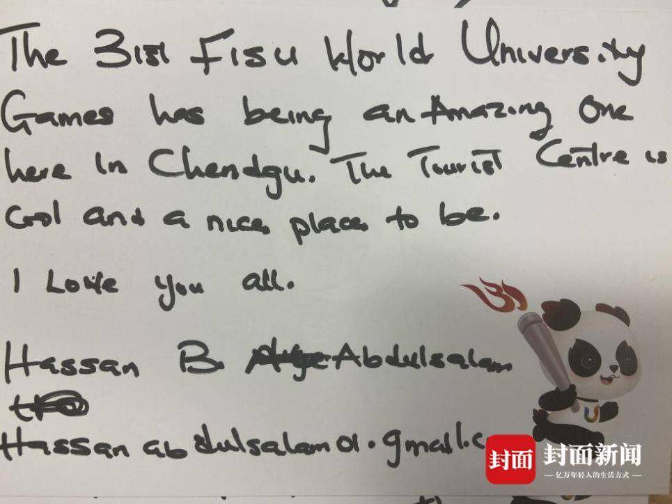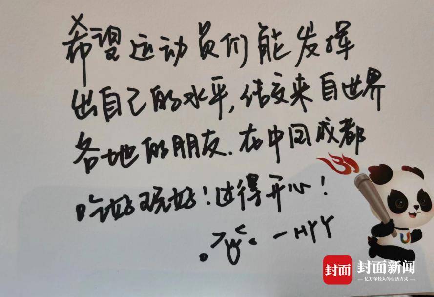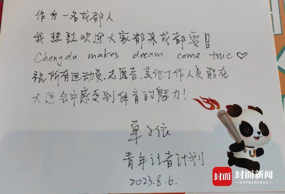来自成都大运会青年记者计划的单子依,是一名成都人,今年刚刚保送成为北京大学新媒体研究院硕士研究生,她通过明信片表达着成都的热情好客,“欢迎大家都来成都耍!祝所有运动员、志愿者、其他工作人员能在大运会中感受到体育的魅力。”
