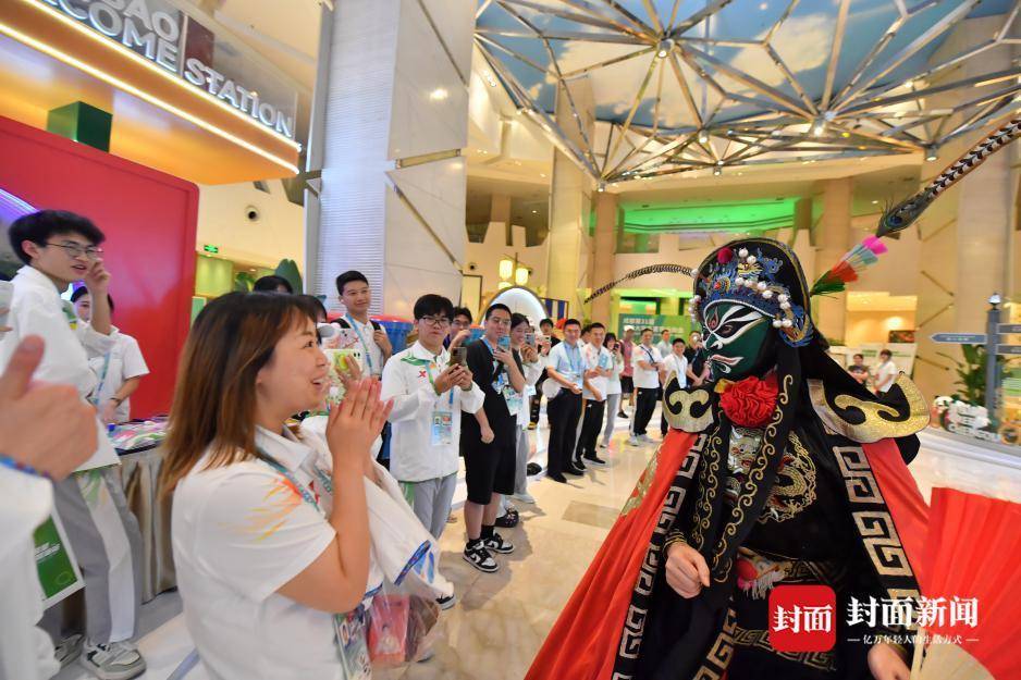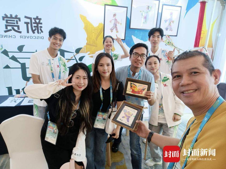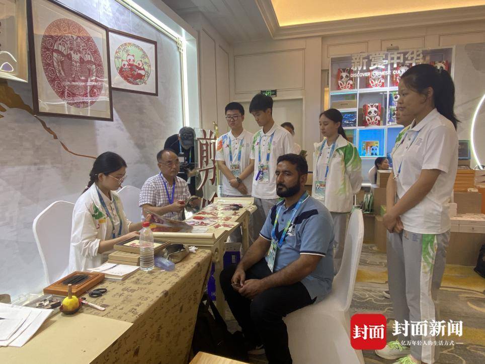 非遗剪纸体验区同样吸引了不少人的关注。四川省一级剪纸艺术家袁成祥仅需短短40秒,便可以剪出一幅传神的人脸剪影,让现场嘉宾高呼“Amazing!”惊叹之后,大家纷纷上前学习剪纸。特别有意义的是,袁成祥还现场剪了一对鸳鸯,用于一对运动员的求婚,为成都大运会增添了一抹浪漫色彩。