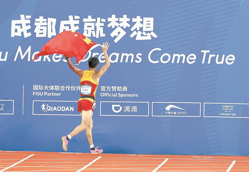 奔向梦想8月2日,双流体育中心,男子100米飞人大战结束后,夺得第三名的中国选手陈冠锋身披国旗绕场庆祝时经过“成都成就梦想”的标语牌。