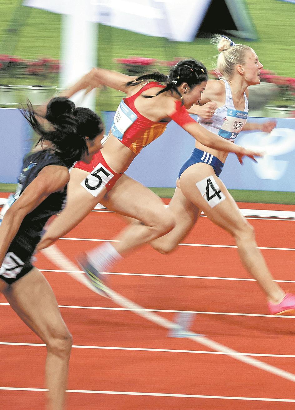 0.04秒8月4日,双流体育中心,大运会女子100米栏决赛,冠亚季军的撞线瞬间。中国选手吴艳妮(中)以12秒76获得第二名,冠军由她身旁的斯洛伐克选手维克托莉娅·福斯特(右一)获得,夺冠成绩为12秒72。0.04秒,一步之遥,四川姑娘吴艳妮憾失冠军。