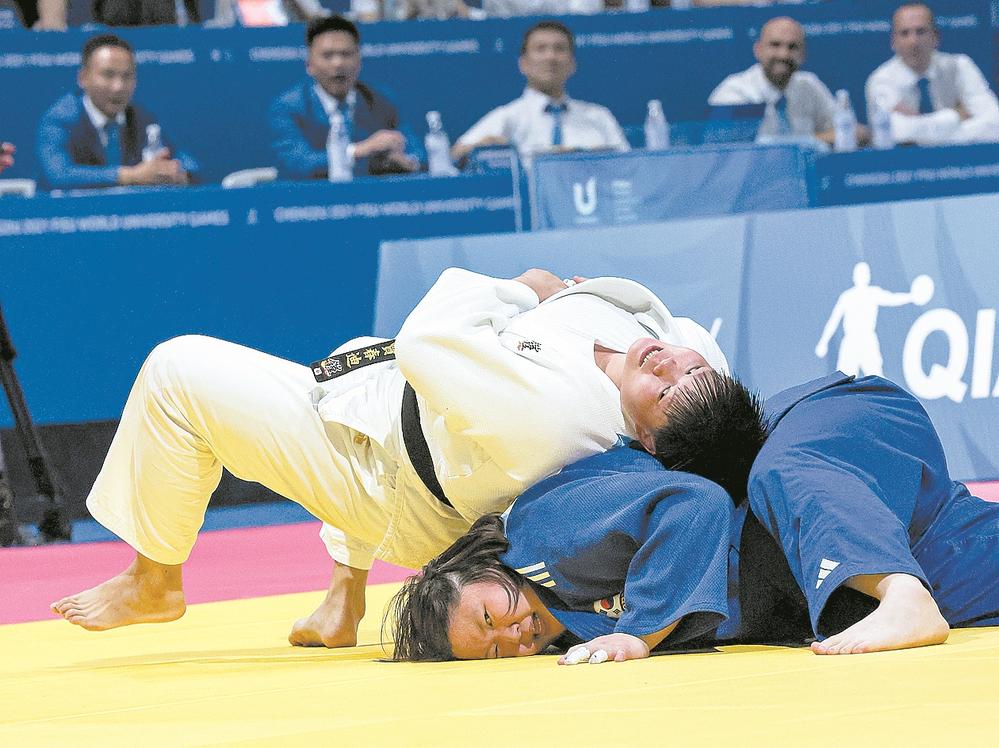 “躺”赢7月31日,简阳文体中心柔道馆,在大运会柔道女子+78公斤级决赛中,中国选手贾春迪战胜韩国选手PARKSaetbyeol,夺得本届大运会柔道比赛中国队第一枚金牌。