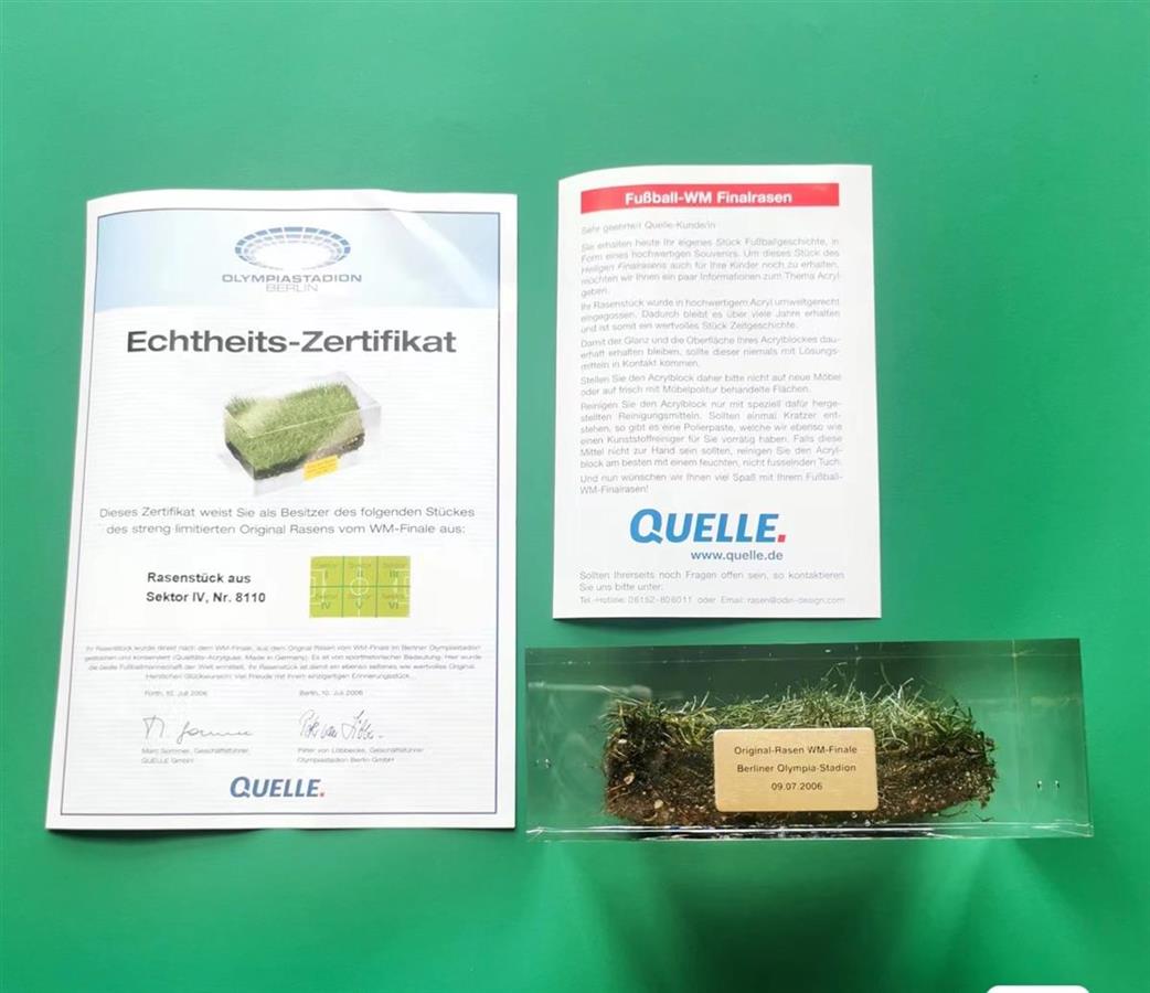 2006年,德国世界杯决赛球场的草皮被一家快递公司买下,并以两种方式出售给球迷。一种是原始状态,一种则是经过处理后密封进玻璃,每块草皮定价75欧元(约人民币596元)。