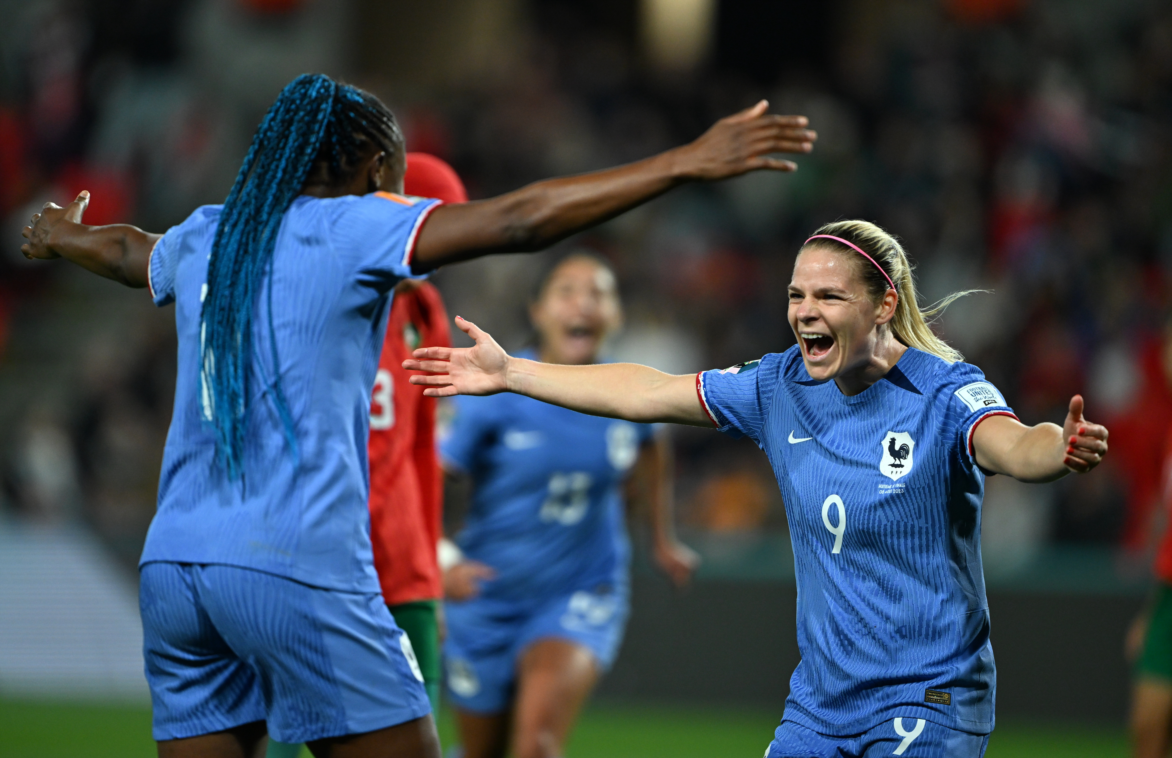 8月8日,女足世界杯八分之一决赛中,法国队球员勒佐默(右)在进球后和队友迪亚尼庆祝。新华社记者李一博摄