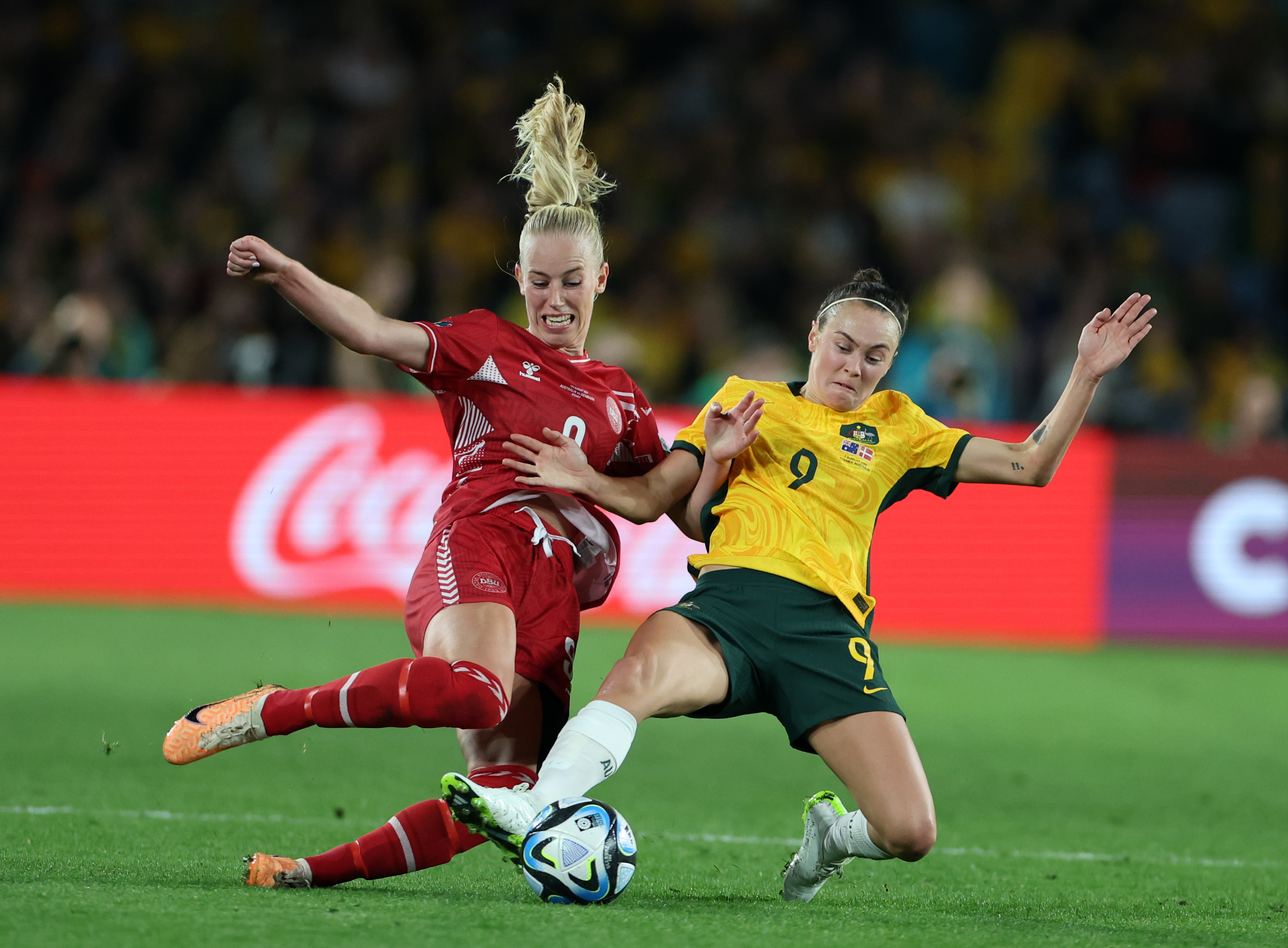 8月7日,女足世界杯八分之一决赛中,澳大利亚队球员凯特琳·福尔德(右)在比赛中与丹麦队球员旺斯高拼抢。新华社记者秦朗摄