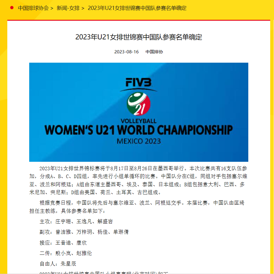 8月16日,据中国排球协会官方网站消息,2023年U21女排世界锦标赛将于8月17日至8月26日在墨西哥举行。本次比赛共有16支队伍参加,分成A、B、C、D四组,率先进行小组单循环的比赛。中国队分在C组,同组对手包括塞尔维亚、波兰和阿根廷;A组由东道主墨西哥、埃及、泰国、日本组成;B组包括意大利、巴西、多米尼加、突尼斯;D组由美国、荷兰、土耳其、古巴组成。