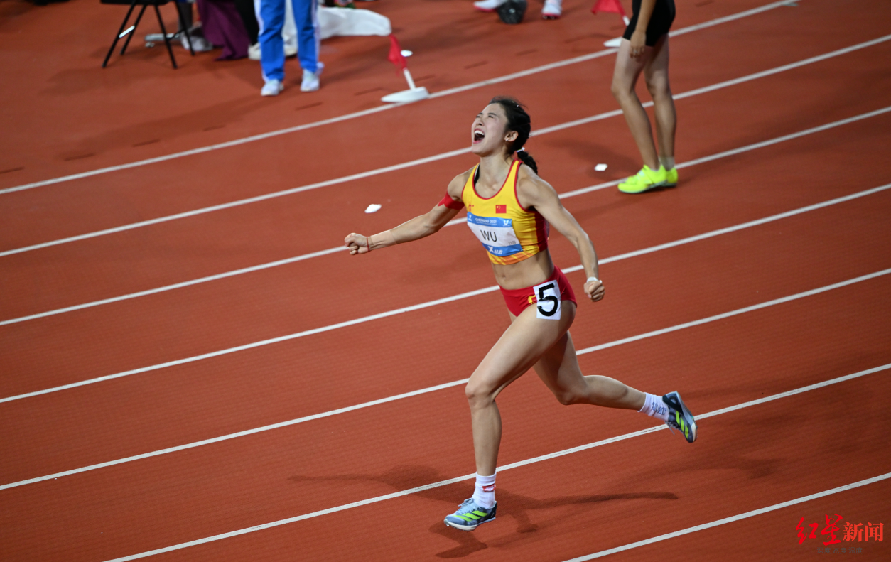 吴艳妮在成都大运会女子100米栏决赛后欢呼。 红星新闻记者 王勤 摄