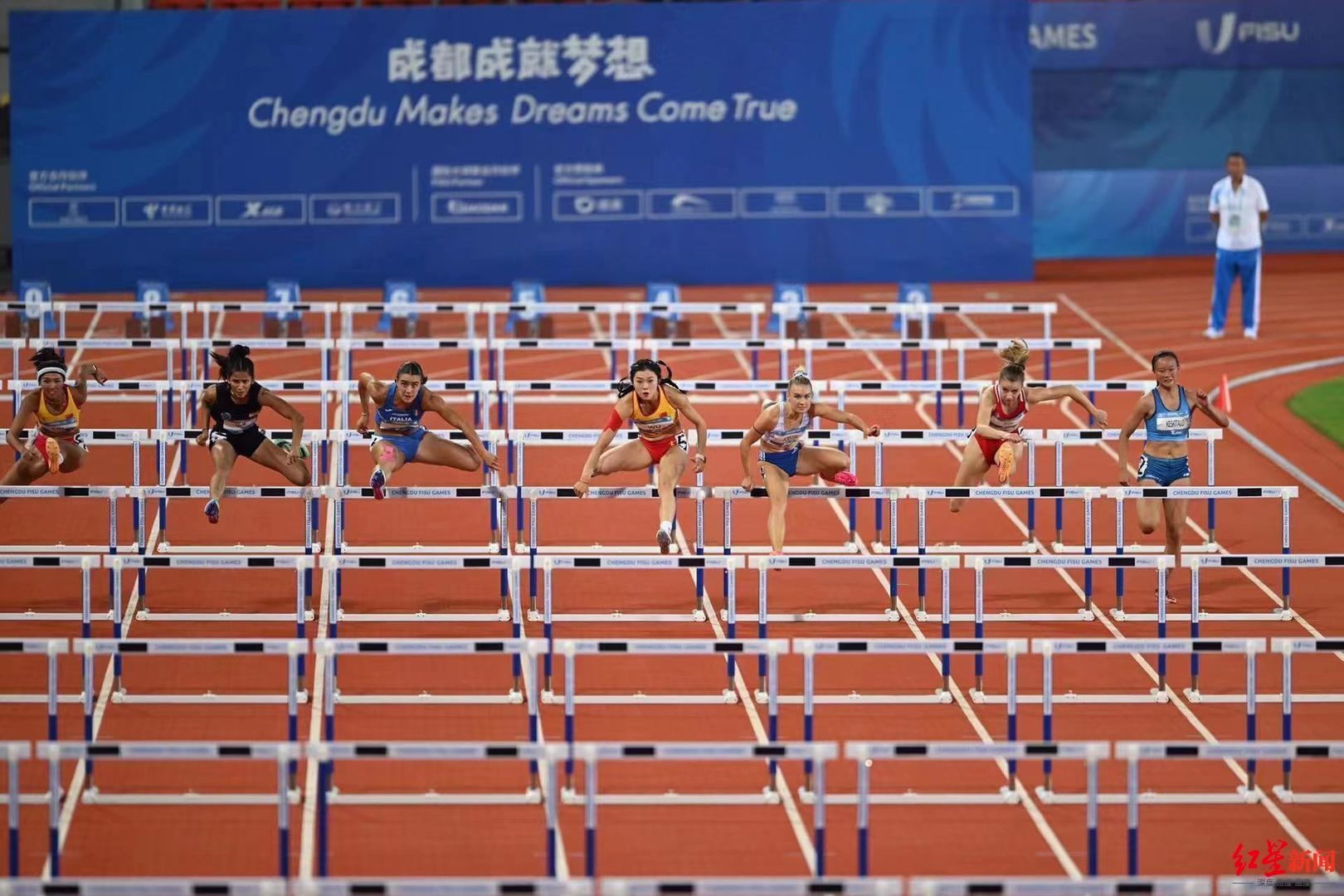 吴艳妮(中)在成都大运会女子100米栏比赛中。 红星新闻记者 王勤 摄