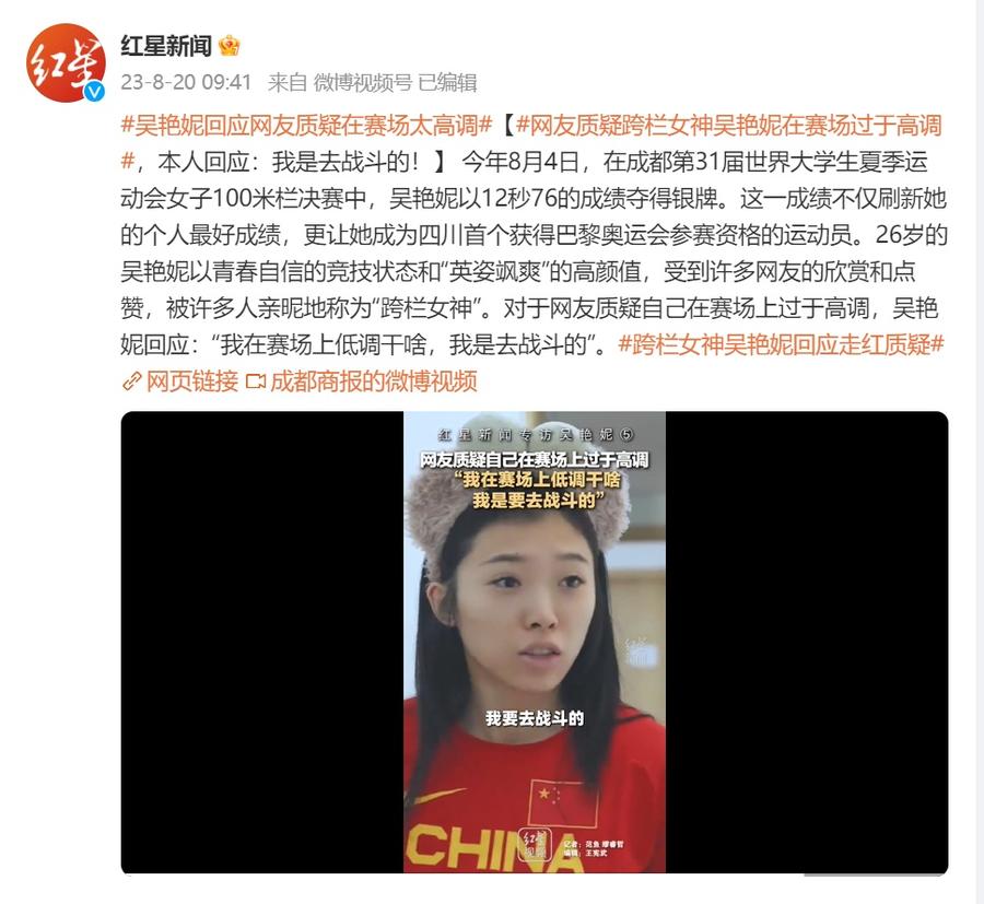 吴艳妮“食指指天”的招牌动作也引发关注,有网友质疑她在赛场上过于高调。