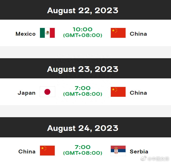 8月21日,据中国女排官方微博消息:2023年U21女排世锦赛八强复赛E组赛程如下(北京时间):8月22日10:00中国女排vs墨西哥女排8月23日07:00中国女排vs日本女排8月24日07:00中国女排vs塞尔维亚女排