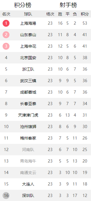中超最新积分榜
