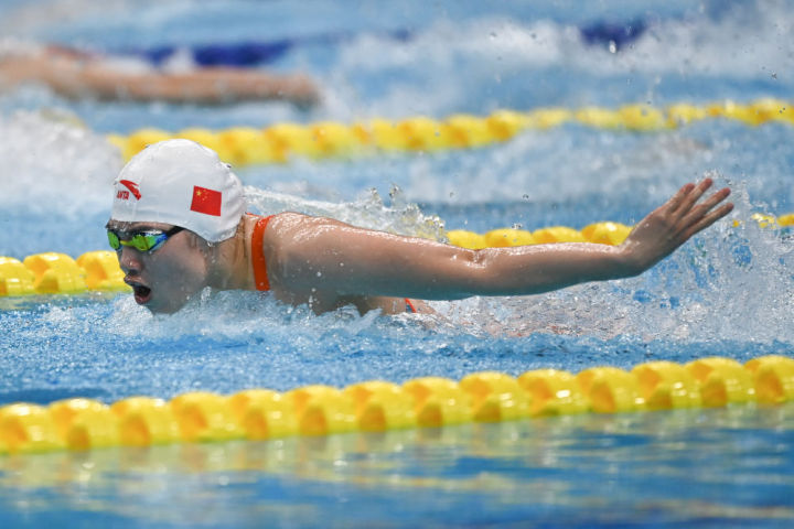 张雨霏在“韵味杭州”2023年全国游泳冠军赛女子100米蝶泳决赛中(2023年5月4日摄)。新华社记者黄宗治摄