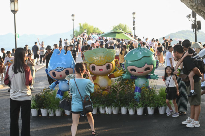 游客在位于杭州西湖景区的断桥边与杭州亚运会吉祥物合影(2023年8月21日摄)。新华社记者黄宗治摄