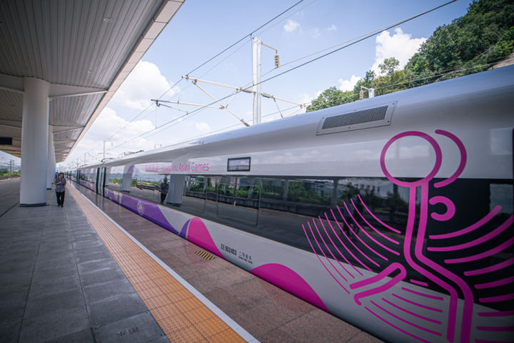 这是亚运智能动车组停靠在德清站站台(2023年8月4日摄)。新华社记者江汉摄