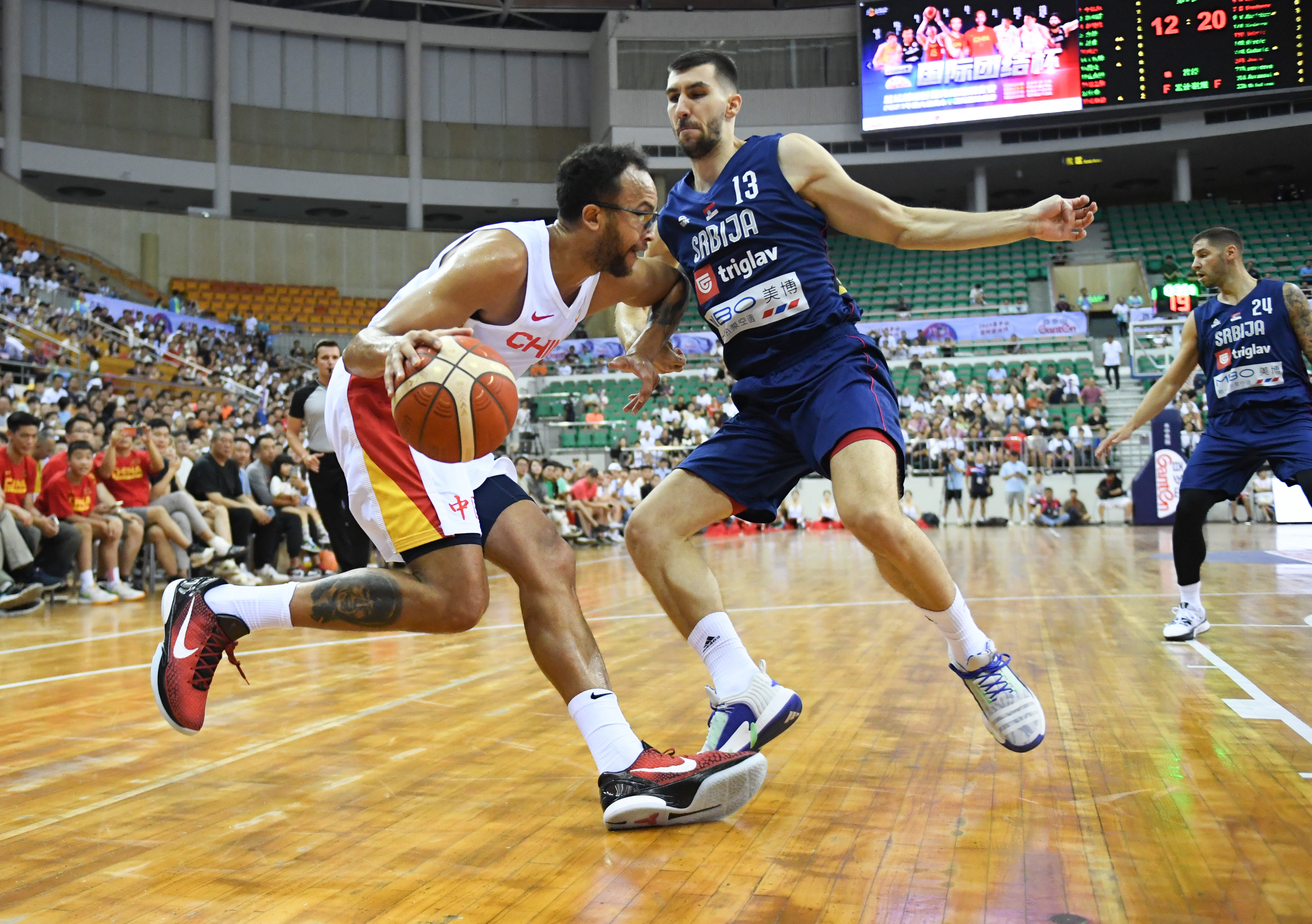 8月20日,在深圳举办的中国队对战塞尔维亚队的国际团结杯篮球赛中,中国队球员李凯尔(左)的突破瞬间。新华社记者毛思倩摄
