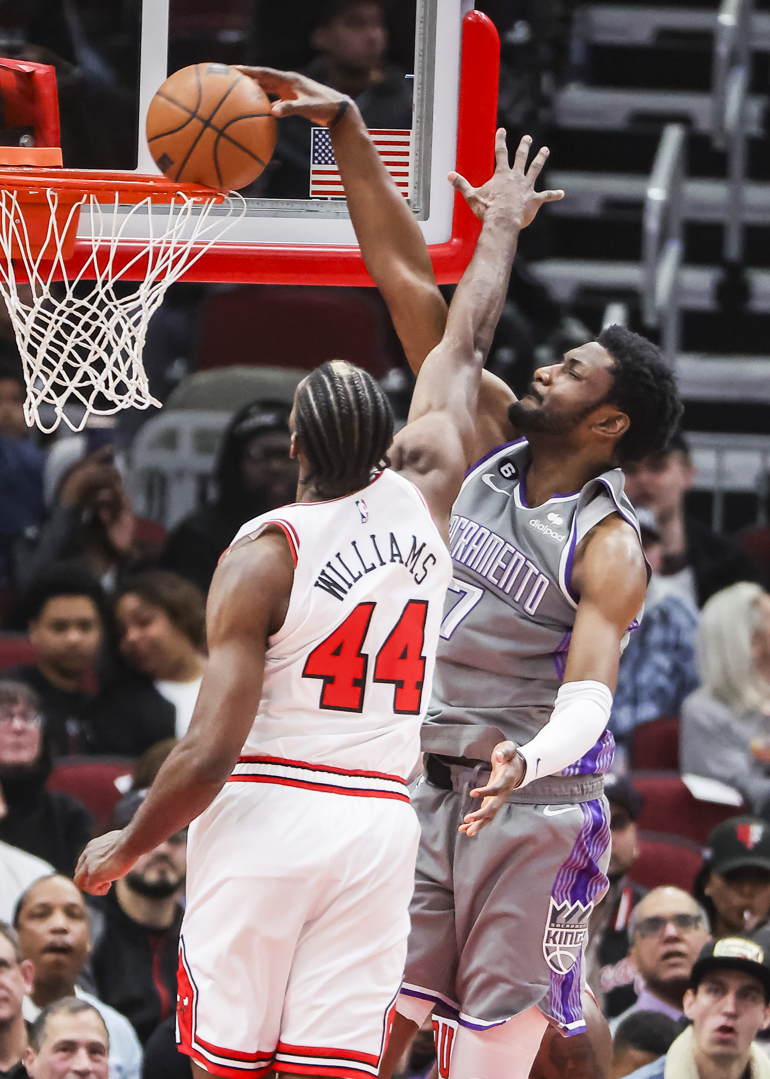 3月15日,效力于萨克拉门托国王队的爱德华兹(右)在比赛中扣篮。当日,在2022-2023赛季NBA常规赛中,萨克拉门托国王队客场以117:114战胜芝加哥公牛队。新华社发(乔尔·莱纳摄)