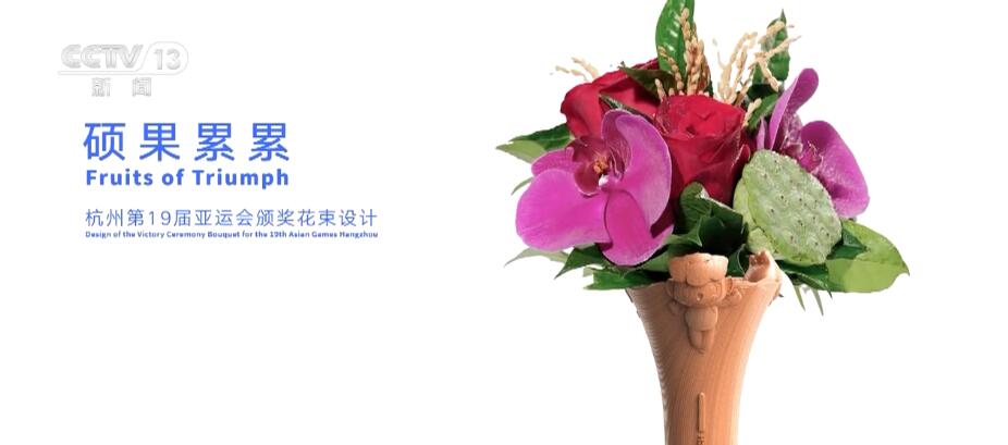 颁奖花束名为“硕果累累”,整体造型分为花材、花器两部分,象征着亚运健儿披荆斩棘、永不言弃的运动精神。其中,花器是本届亚运会颁奖花束的一大创新,由国家级非物质文化遗产东阳木雕制作而成,可供获奖运动员永久保存。