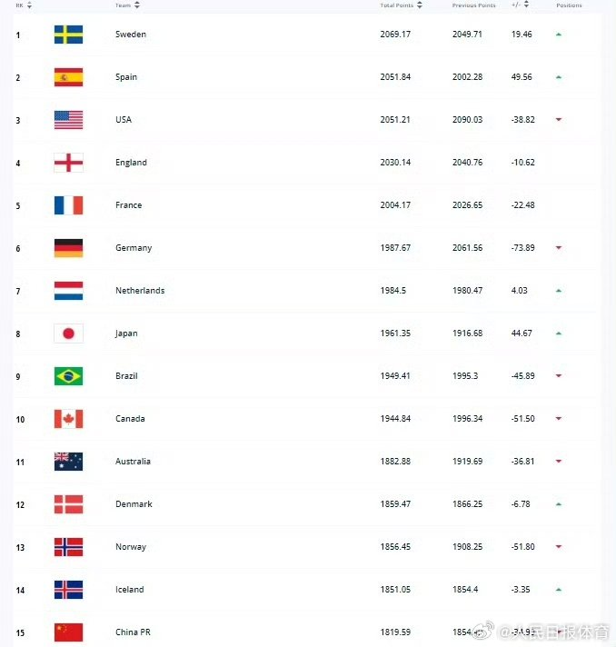 @人民日报体育消息,国际足联今日(8月25日)更新女足世界排名,中国女足排名下降一位到第15位。