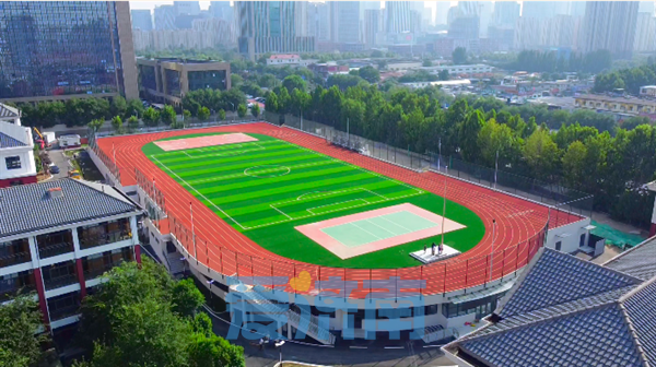 运动场地面高约4米,露天顶层为足球场和300米塑胶跑道操场,同时建有排球场和篮球场各一个;地下两层分别为室内篮球场和塑胶跑道,其中篮球场在地下约5米,室内约200米的塑胶跑道高度与校园地面基本齐平,平时学生可以在露天田径场地运动,当遇到雨雪天气时,可在地下塑胶跑道运动。
