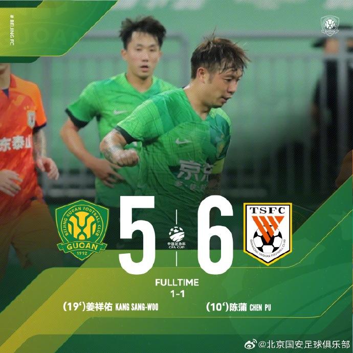 点球大战中,北京国安队姜祥佑未能命中,国安最终在点球大战中4-5落败。最终,北京国安以总比分5-6惜败于对手。