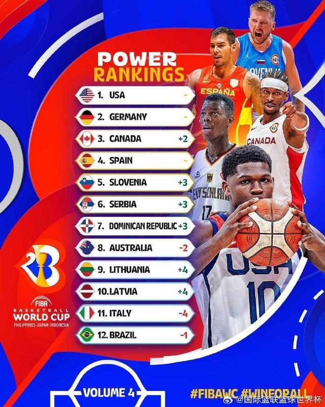 国际篮联官方发布2023篮球世界杯最新实力排行榜,美国队稳居榜首,德国队居于第2,加拿大队升至3。而中国男篮的排名下滑6位,目前位列第27。