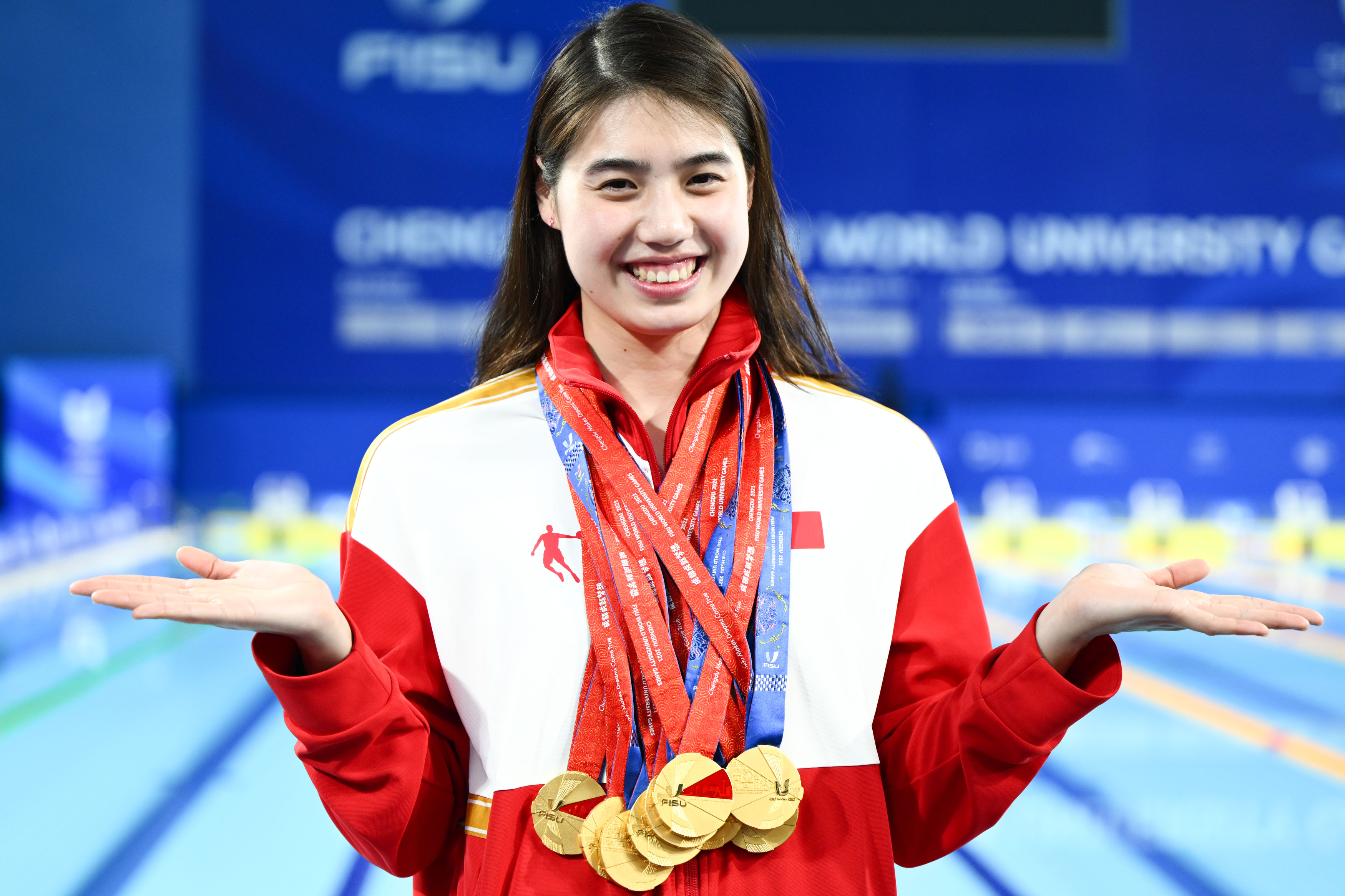 8月7日,张雨霏展示她获得的九枚大运会金牌。新华社记者吴刚摄