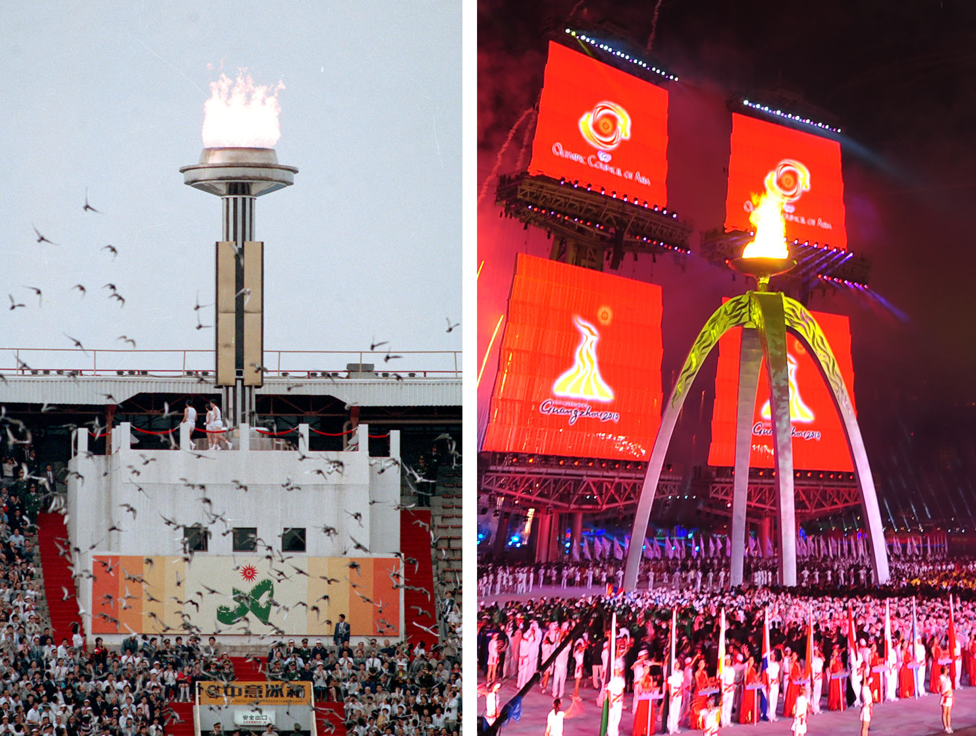 左图:1990年9月22日,第十一届亚运会开幕式在北京工人体育场举行。