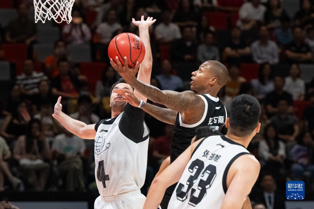 9月17日,国际篮球明星队球员托马斯(中)在比赛中。新华社记者张金加摄