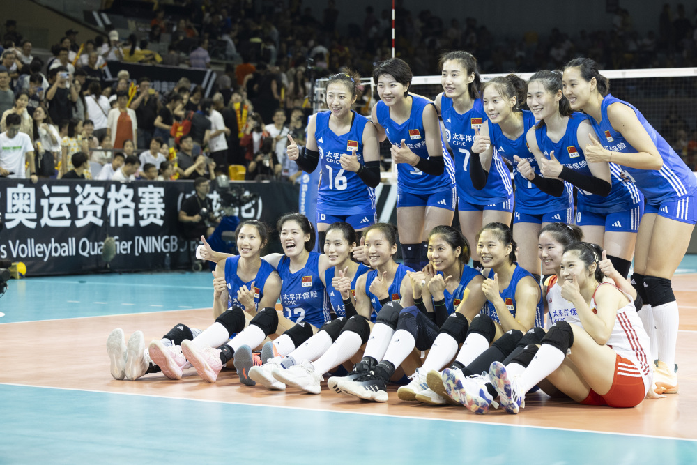9月17日,中国队球员在赛后合影。当日,在浙江省宁波市举行的巴黎奥运会女排资格赛A组比赛中,中国队以3:0战胜墨西哥队。新华社记者 张涛 摄