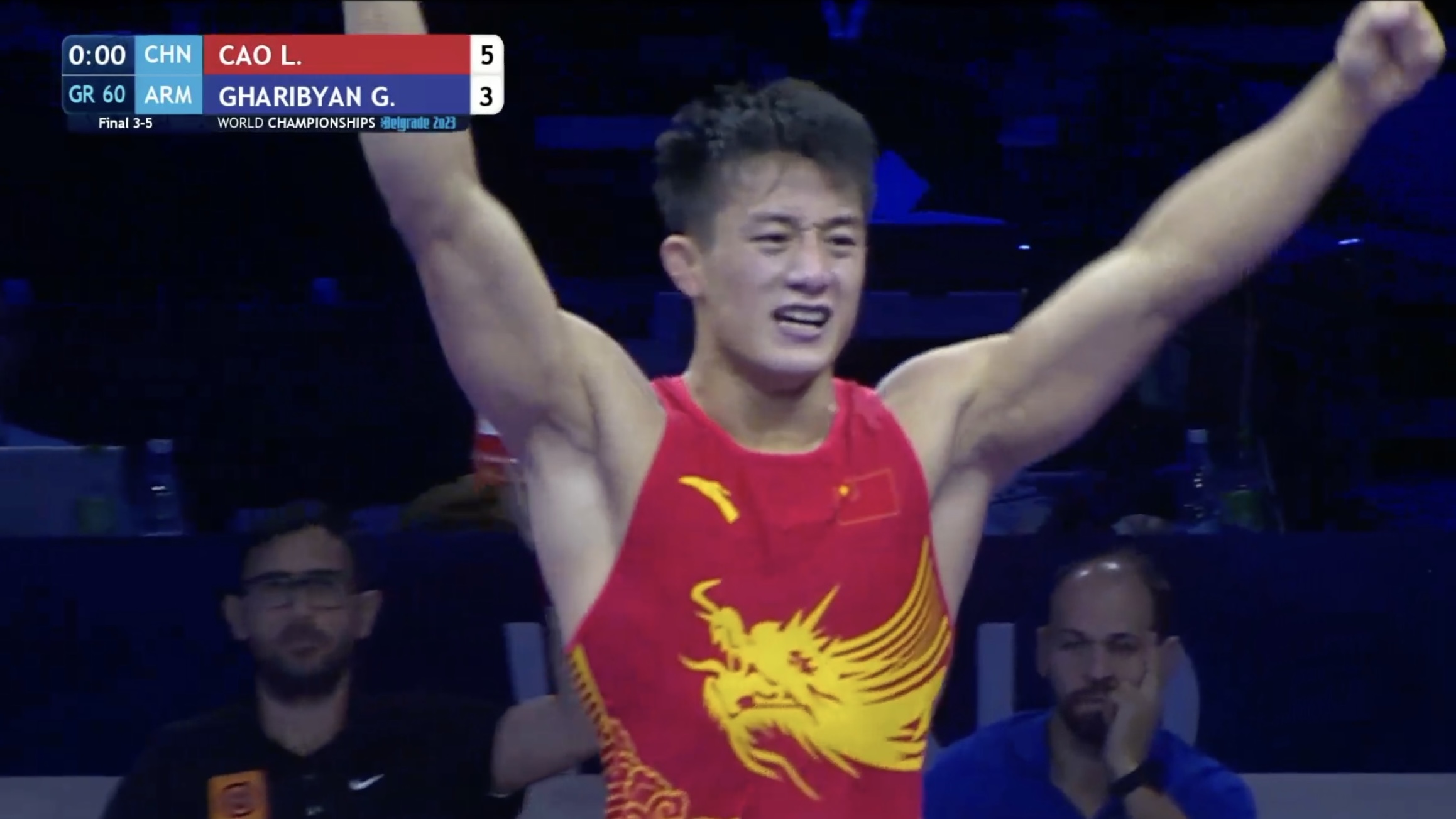 曹利国在赛后庆祝胜利。图片由中国国家摔跤队提供
