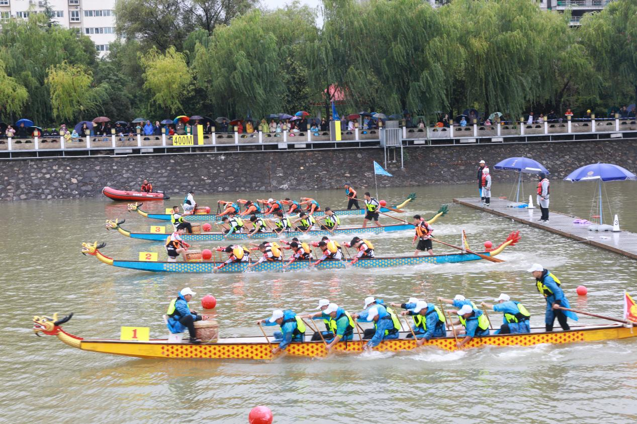 两天时间里,商洛市滨江银杏公园的雨雾笼罩着横贯其中的丹江水面,随着比赛口令发出,条条龙舟如跤龙出水,追逐向前,选手们随着鼓声的指挥整齐挥桨,全力冲刺,以决高下,岸边数千观众或打伞或身着雨衣为运动员的拼搏精神叫好助威,两岸五彩的雨伞与滨江绿植形成了一幅美妙的画面。