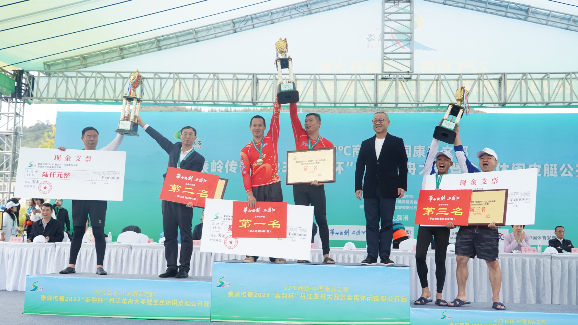 经过2天的激烈较量,各项目的名次也全部产生,秦韵教育龙舟队、丹凤县龙舟队、商洛体育系统龙舟队分获地方组500米、200米直道竞速前三名,东莞莞义龙舟队、福建三明元动力龙舟队、商洛市代表队分获公开组500米直道竞速前三名,东莞莞义龙舟队、商洛市代表队、商洛市龙舟运动协会分获公开组200米直道竞速前三名,张首一、潘国亮、王军分获个人皮艇前三名,东莞莞义龙舟队、商洛市代表队、福建三明元动力龙舟队获得公开组团体奖冠、亚、季军,秦韵教育龙舟队、丹凤县龙舟队、商洛体育系统龙舟队获得地方组团体奖冠、亚、季军,陕西秦韵实业有限公司获突出贡献奖。