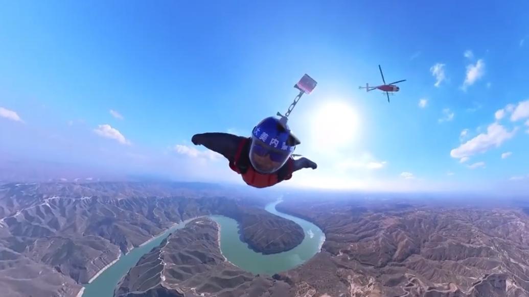 26日,翼装飞行运动员张树鹏在内蒙古自治区的老牛湾黄河大峡谷附近进行翼装飞行高空飞越,以翼装飞行的独特视角展示黄河与长城“握手”的雄奇景观。